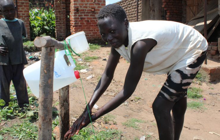 Evelyn, one of the students at our secondary school, is shown demonstrating to members of the Namatala community how to use a tip tap water dispenser with soap for maximum benefit.
